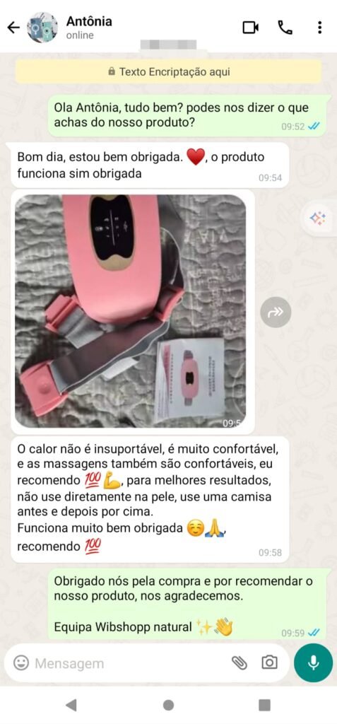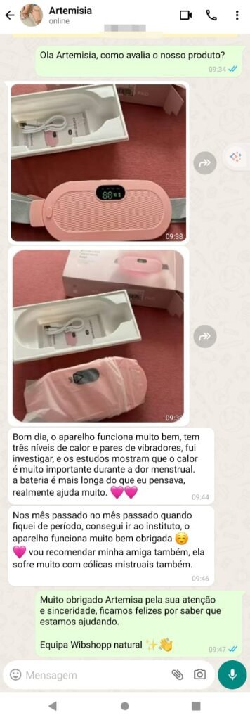 “Sofria muito com dores menstruais fortes. Desde que comecei a usar este cinto, sinto-me muito melhor. Alivia em poucos minutos e posso continuar o meu dia normalmente. Recomendo a todas as mulheres!